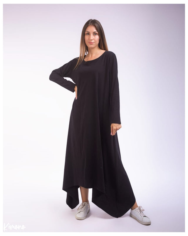 Long sleeve cotton dress - asymmetric hem - round neckline - flared fit