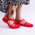 This footwear features a retro-inspired jelly sandal design with a block heel, offering both style and stability. The open, woven upper provides breathability, while the adjustable strap at the back ensures a secure fit. Made from a glossy, flexible material, it's easy to clean and ideal for casual summer wear. Perfect for pairing with dresses, skirts, or cropped pants for a playful yet chic look