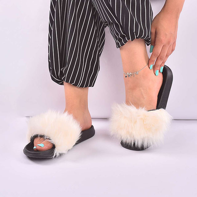 FUR HOUSE SLIPPERS - This fuzzy slippers is flexible slip on open toe style.It's super soft.This fur slippers is striking the right balance between comfort and sexy.