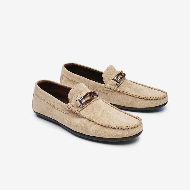 An elegant men's slip-on loafer, crafted from soft suede material in a light beige color. It is comfortable and features a flexible sole. A decorative metal ornament is placed on the upper part, making it ideal for daily and casual outfits.